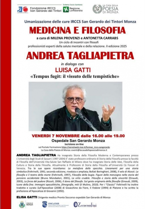 Venerdì 7 novembre, dalle 16.00 alle 19.00, all'Ospedale San Gerardo di Monza prende avvio il ciclo "Medicina e Filosofia" (Umanizzazione delle cure IRCCS). Il primo incontro avrà come protagonista Andrea Tagliapietra in dialogo con Luisa Gatti su"Tempus fugit: il vissuto delle tempistiche".