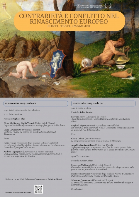 Nei giorni 20 e 21 novembre si terranno, presso l'Università di Trento (Dipartimento di Lettere e Filosofia, aula 001), le giornate di studio "Contrarietà e conflitto nel Rinascimento europeo. Fonti, testi, immagini", dedicate ad esplorare la produttività del dissenso nella cultura rinascimentale attraverso fonti filosofiche, letterarie e iconografiche. Referenti scientifici: Salvatore Carannante e Fabrizio Meroi […]