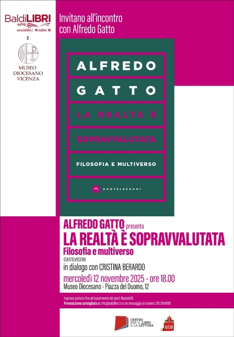 Mercoledì 12 novembre 2025, ore 18.00, presso il Museo Diocesano di Vicenza (Piazza del Duomo, 12), Alfredo Gatto presenterà il libro La realtà è sopravvalutata. Filosofia e multiverso (Castelvecchi, 2025) in dialogo con Cristina Berardo. L'evento è promosso da BaldiLIBRI APS e dal Museo Diocesano di Vicenza.