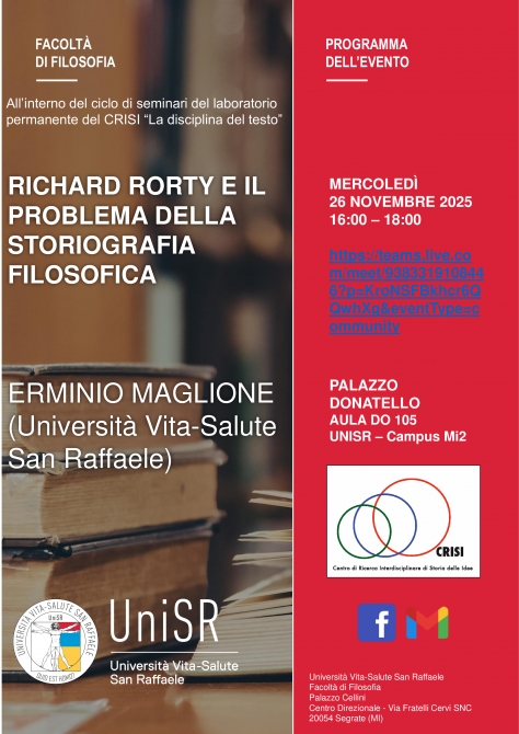 Prosegue la seconda edizione del Seminario permanente del CRISI "La disciplina del testo". il secondo incontro avrà come protagonista il dott. Erminio Maglione, che si concentrerà sulla questione della storiografia filosofica in Richard Rorty. L'incontro si terrà mercoledì 26 novembre (ore 16-18) presso il Palazzo Donatello (aula DO 105) della Facoltà di Filosofia dell'Università Vita-Salute […]