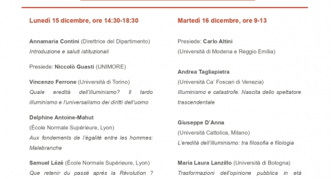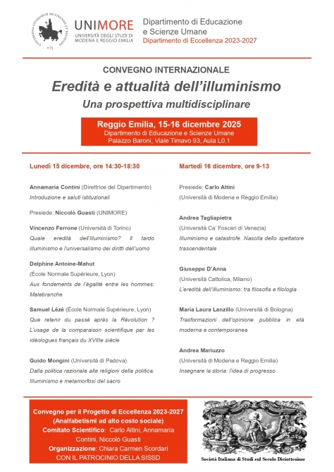 Segnaliamo il convegno internazionale "Eredità e attualità dell'illuminismo. Una prospettiva multidisciplinare" che si terrà presso il Dipartimento di Educazione e Scienze Umane dell'Università degli Studi di Modena e Reggio Emilia (UNIMORE) dal 15 al 16 dicembre 2025. Il convegno è organizzato dal prof. Carlo Altini e vedrà la partecipazione del prof. Tagliapietra.