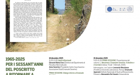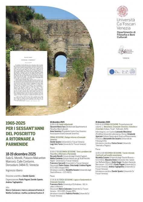 Il Dipartimento di Filosofia e Beni Culturali di Ca' Foscari dedica due giornate- 18 e 19 dicembre 2025- al sessantesimo anniversario del Poscritto a Ritornare a Parmenide, con un programma di interventi e tavole rotonde incentrate sull'eredità del pensiero severiniano. Gli incontri si terranno presso la Sala G. Morelli del Palazzo Malcanton Marcorá (Calle Contarini […]