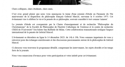 Gabriele Marcel. La force d'une pensée- 14 dicembre 2023 Journée d'étude en l'honneur du 50e anniversaire de la disparition du philosophe français Gabriel Marcel, survenue le 8 octobre 1973. Cet événement vise à célébrer la vie et la pensée de ce philosophe. La journée d'étude est coorganisée par la Chaire d'enseignement et de recherche"Philosophie […]