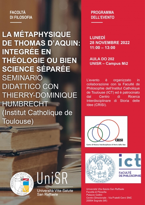 Lunedì 28 novembre (11.00-13.00) si terrà il seminario didattico di Thierry-Dominique Humbrecht dal titolo "La métaphysique de Thomas d'Aquin: integrée en théologie ou bien science séparée". L'evento è organizzato in collaborazione con la Faculté de Philosophie dell'Institut Catholique de Toulouse (ICT) e vedrà anche la partecipazione del Preside della facoltà tolosana, il prof. Andrea Bellantone […]